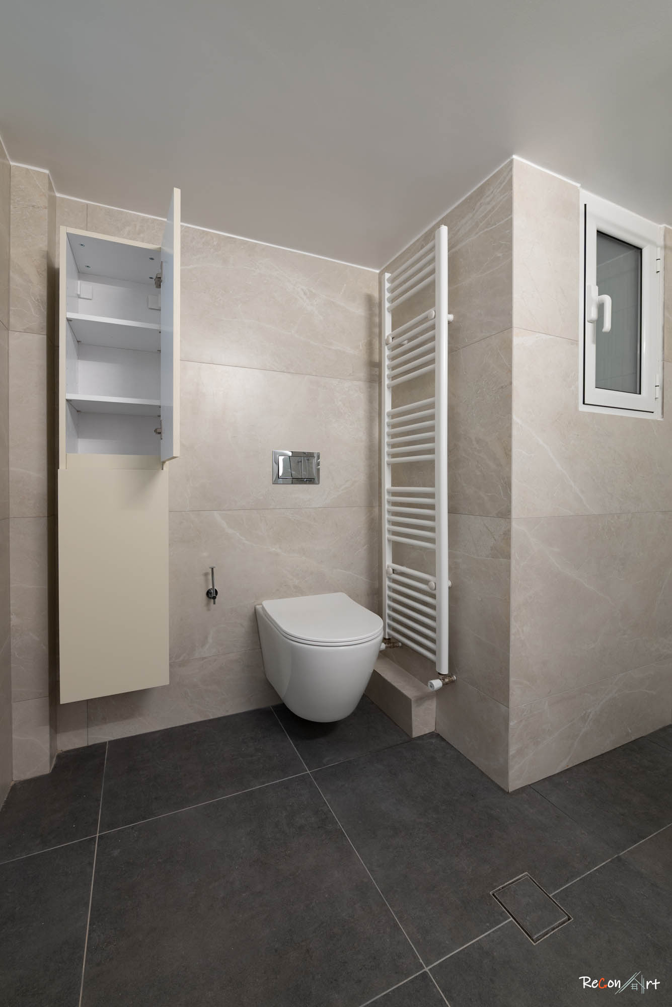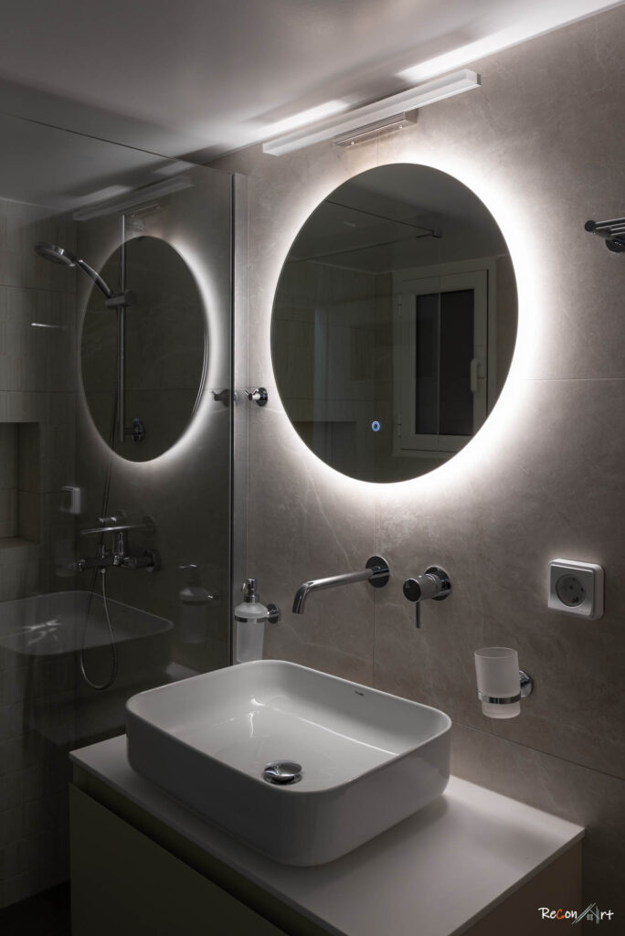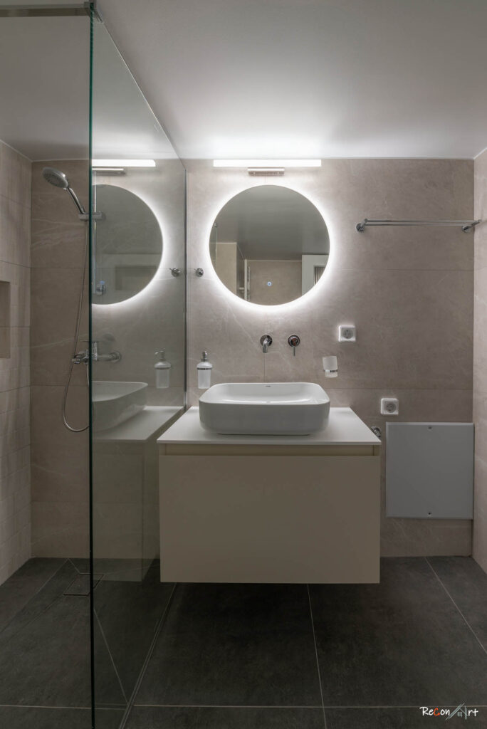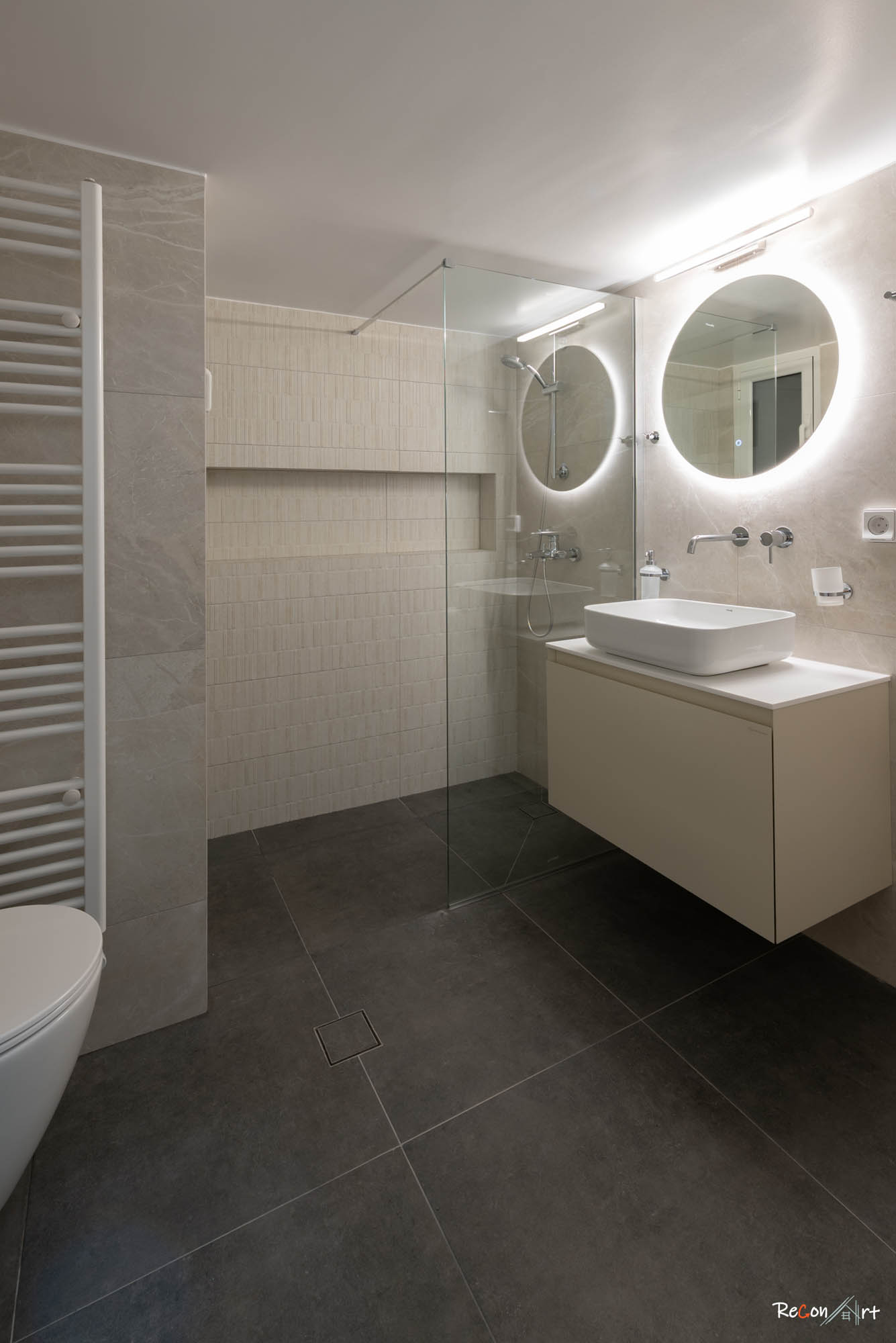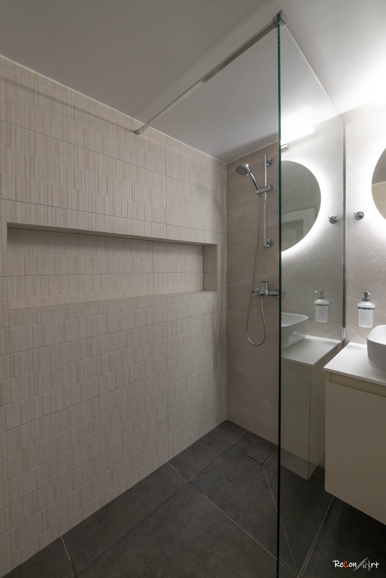 - Προμήθεια και τοποθέτηση ειδών υγιεινής σε λουτρό. Χτιστή ντουζιέρα με καμπίνα, από κόντρα πλακέ θαλάσσης λάκα με καθρέπτη Led και επικαθήμενο νιπτήρα. Κρεμαστή λεκάνη Ceramita με εντοιχιζόμενο καζανάκι Tece, αξεσουάρ λουτρών